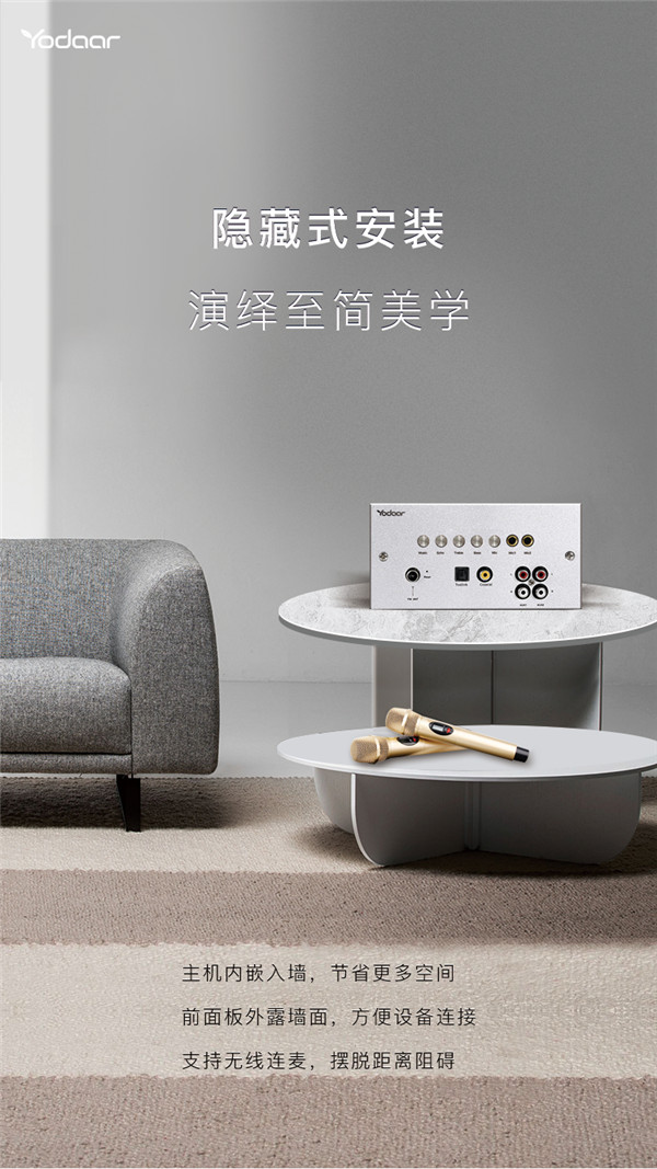 不同于一般K歌系統(tǒng)需要占用很多空間,悠達客廳K歌系統(tǒng)不僅體積小,而且采用內(nèi)嵌入墻式安裝,既節(jié)省了空間,也能保證視覺上的簡潔美觀。同時,前面板外露墻面,又方便與電視、背景音樂系統(tǒng)連接,營造一個舒適、理想的K歌環(huán)境。