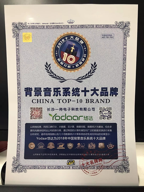 Yodaar悠達(dá)為2018年中國(guó)背景音樂(lè)系統(tǒng)十大品牌