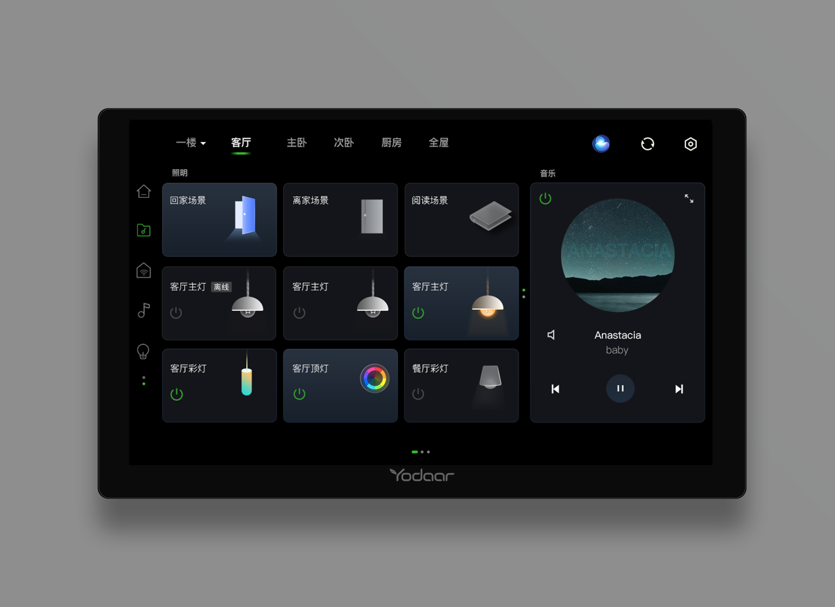 而除了控制音樂,它和悠達其它系列的背景音樂主機一樣,可作為智能中控屏控制全屋智能家居,只要家中可接入的智能設備,如燈光、窗簾、安防監控、云門鈴等,都可以通過它集中控制。平時用來聽歌,需要控制智能設備時一鍵切換至中控界面,不同設備間還能進行聯動,打造出豐富的智能場景。